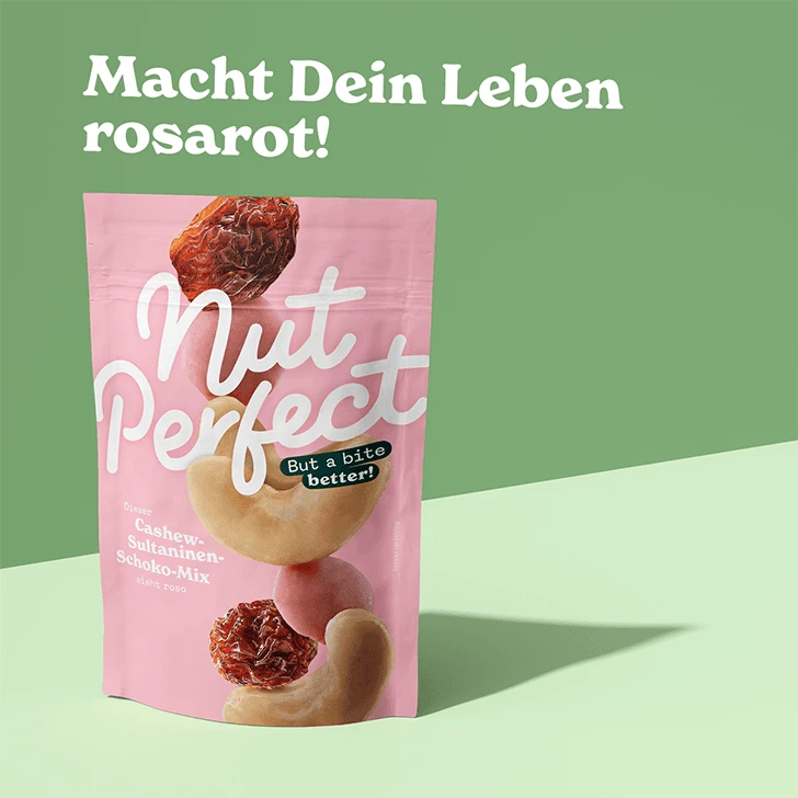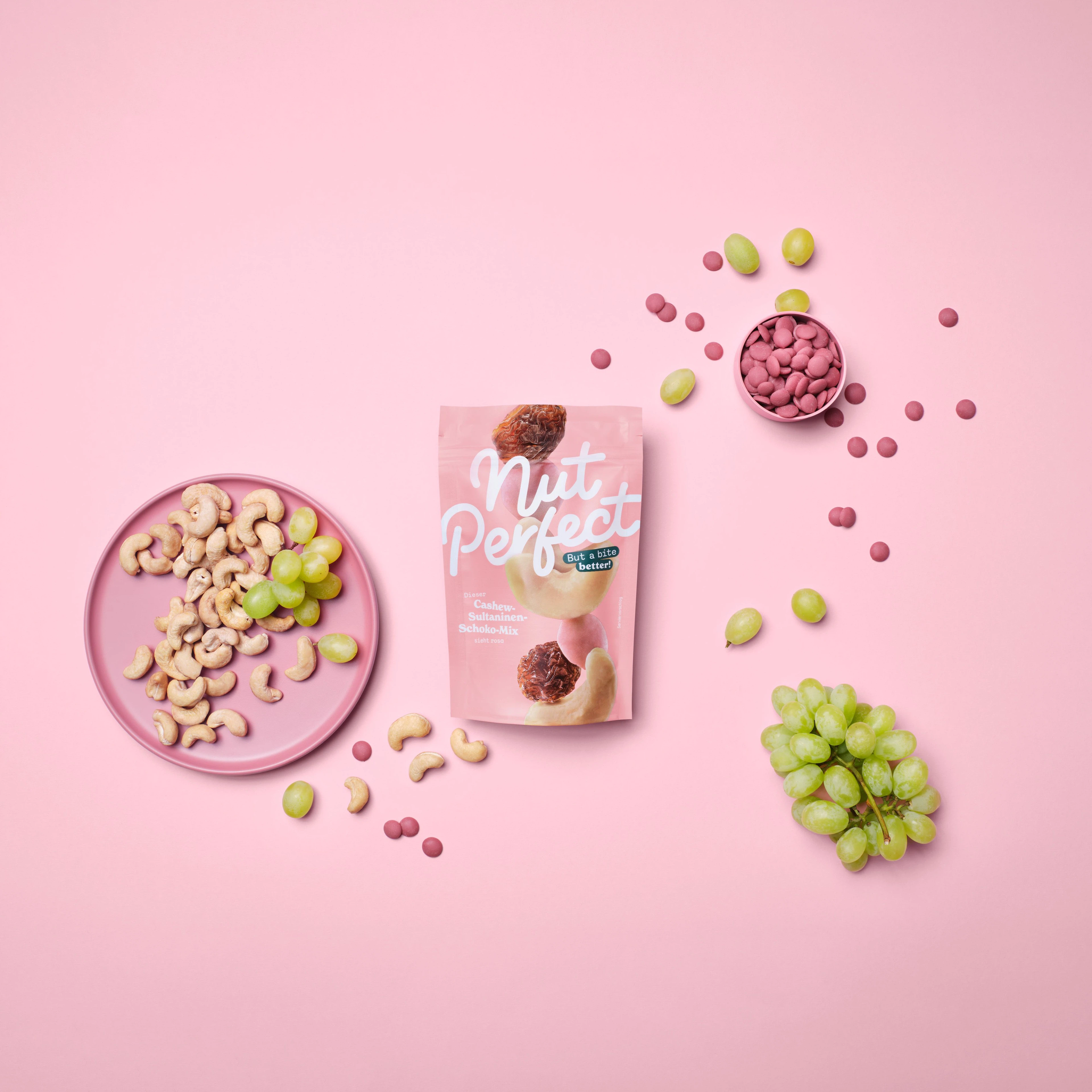 Natürlich überzeugt auch der Rest des Trios aus Cashewkernen, Sultaninen und Schoko-Drops – und nicht nur das Auge. Diese rosafarbene Mischung ist knackig, saftig und cremig zugleich. Knackige Cashews treffen auf saftige Sultaninen und beerig-süße Ruby-Schokolade. Unwiderstehlich! Überzeug dich am besten selbst davon.